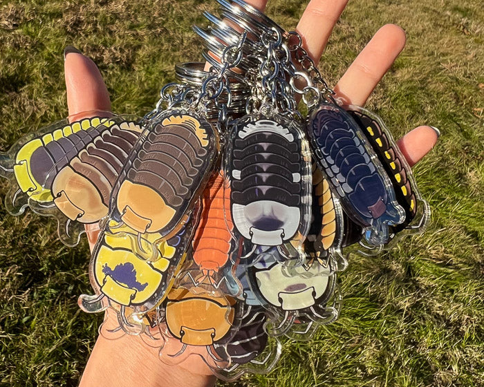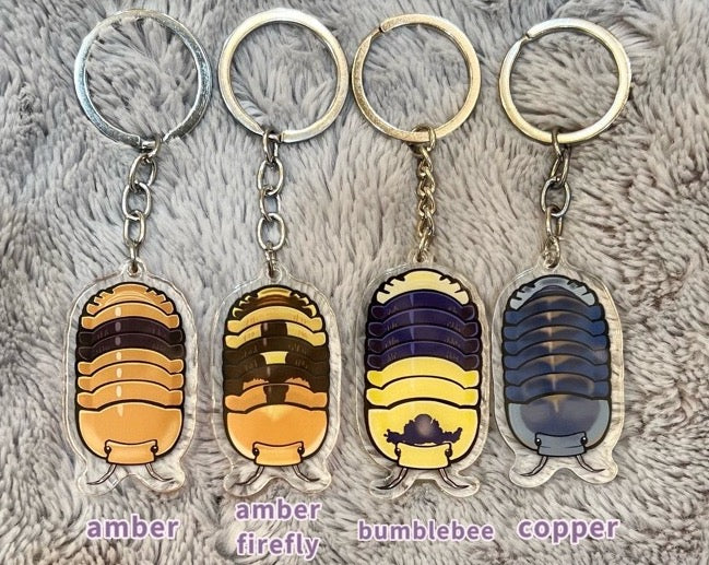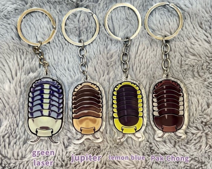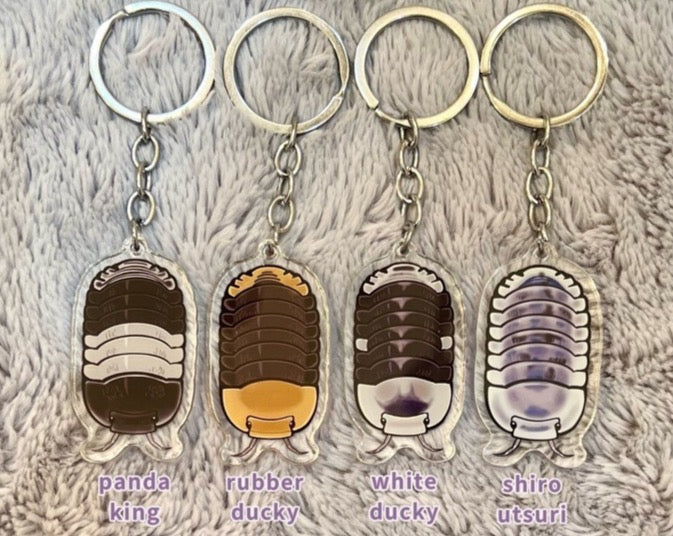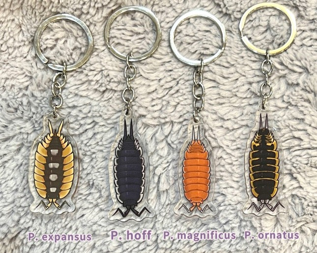 These are double-sided acrylic keychains with metal rings attached. The keychain charm is about 2 inches long with varying widths depending on the species.